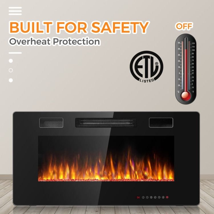 12 flame colors and 12 bed colors to choose5 settings of brightness of bed and flame color750W/1500W heat setting options with front air ventDelicate crystal decoration reflects light giving stunning lookRemote control with battery adds convenient usageHigh quality touch screen with clear LED displayBuilt-in timing function can set the time from1 to 8 hoursWall-mounted or insert to install, space-saving and simpleNo dust and other harmful gases produced by the fireplaceOverheat protection device, automatically cut off when the temperature is too highETL certification ensures long time services and user's safety