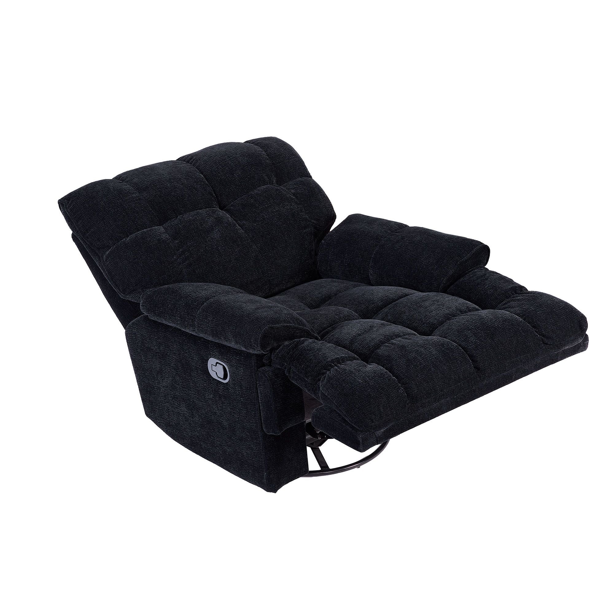 360 Degree Swivel Fabric Single Sofa Heavy Duty Reclining Chair for Living Room, BLACKSITTING COMFORT: Unique overstuffed plaid backrest to provide soft and stable support for your back, generously padded armrests and widened seat provide unparalleled comfort in any position. Just pull the handle on the side open the footrest, then you can recline and stretch your body, and stay at any angle to meet any of your needs(max 160 degree).GLIDING SWIVEL: 360 Degree Swivel Rocker Recliner Chairs, overstuffed seat back and footrest can be adjusted smoothly, chose the position you want when watch TV, read books or take a nap,rocking function to help you dispel stress and fatigue, Relax your whole body like 0 gravity. What a great gift choice for yourself or someone you care about.HIGH QUALITY:Highly elastic foam backrest and seat cushion can relieve you of all muscle fatigue, the built-in spring package gives you a ultimate comfortable sitting feeling.