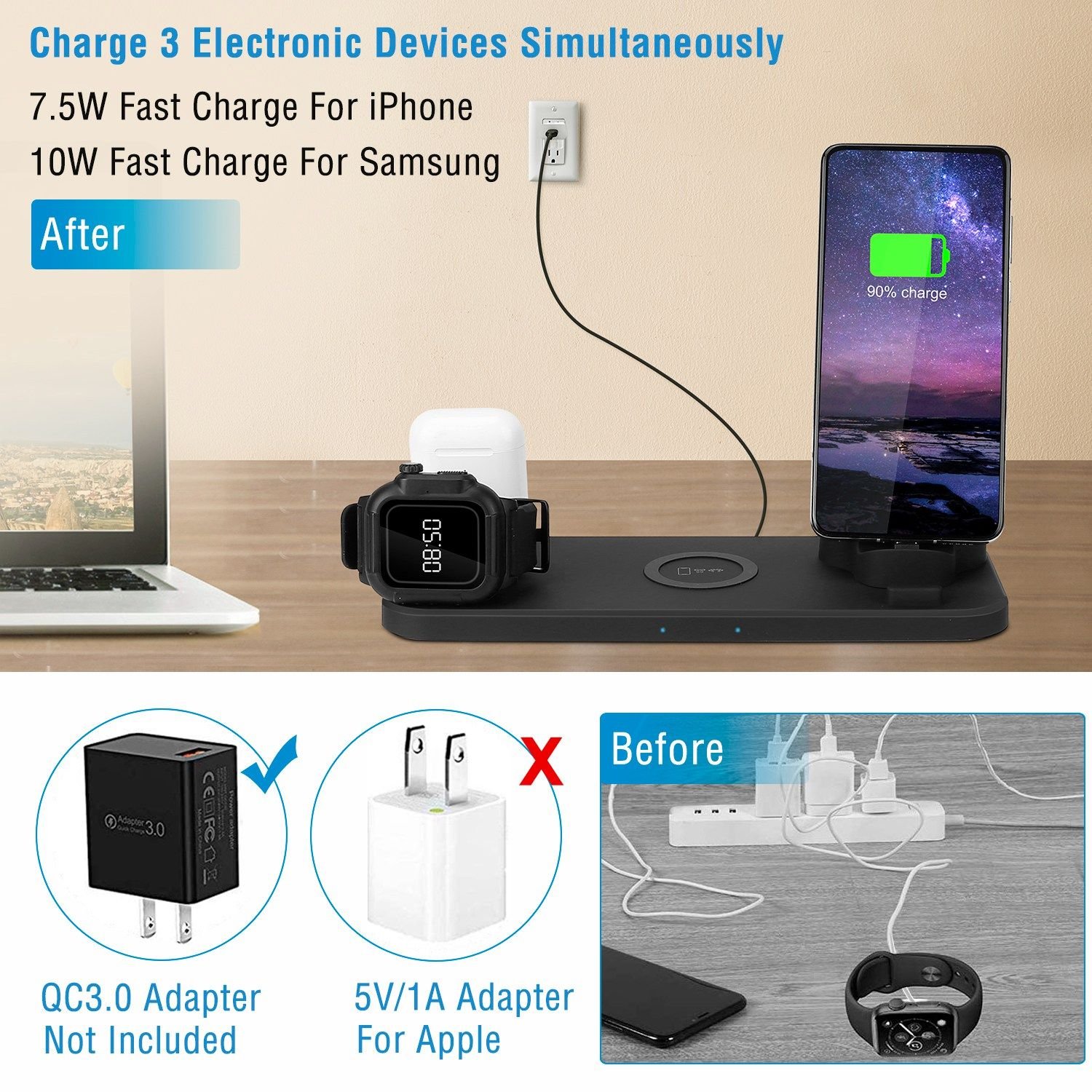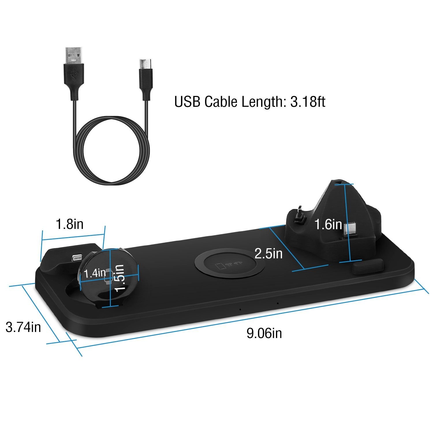 *WIDELY COMPATIBILITY*:No need to connect three cables for each device anymore,use our wireless charging stand to charge for iWatch 1/2/3/4/5 and for Airpods Pro/1/2 and any Qi-certified devices at once!Come with three kinds of ports,it supports any IOS phone/Micro USB phone/Type-C phone. Optimal solution organizes your workspace.
