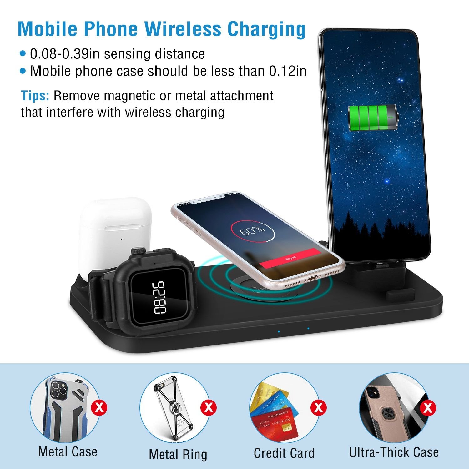 *ADVANCED SAFETY PROTECTION*:Special multi-protect technology provides temperature control,surge-protection,short-circuit prevention,over discharge protection to protect your charging devices. The wireless charging stand supports charging the phones even through the phone case(The thickness of case is less than 3mm/0.12in). Please remove metal and magnetic objects like credit cards,and other such objects that can cause hindrance in charging signals.