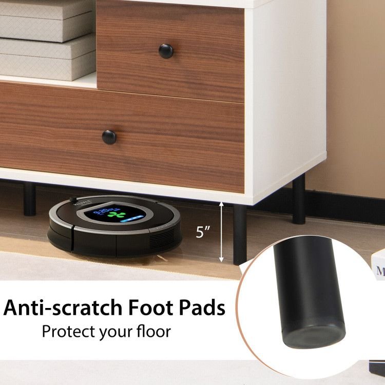 4.5-Leg Sturdy Construction: The cabinet is made of thickened engineered wood, and is supported by 5 heavy-duty steel legs, of which the middle leg can effectively prevent the cabinet base from sinking or deforming. In addition, the metal legs are fitted with anti-scratch pads to protect the floor.