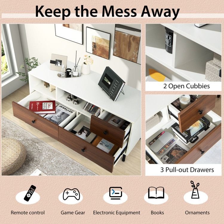 2.Adequate Storage Options: Equipped with 2 open cubbies and 3 pull-out drawers, the TV console cabinet holds plenty of sundries, such as remote control, game gear, electronic equipment, books, and ornaments, which helps keep the mess away. By the way, the convenient drawer handles and the mute & smooth metal slides make it easy to open the drawer.