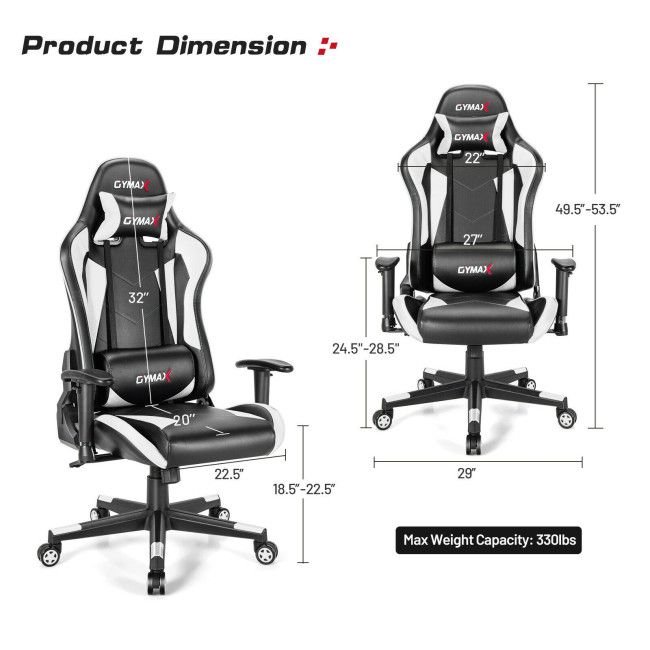 This gaming chair comes with multiple adjustable functions to perfectly meet all your needs in daily use. The seat height can be adjusted from 18.5" to 22.5" and the backrest can be tilted from 90° to 160° to meet your ideal position for working, gaming or reading. The ergonomic high back and wide seat perfectly fit your body shape to provide a super comfortable sitting experience. The comfy headrest and lumbar cushion help reduce discomfort in your neck and waist for better relaxation. Besides, the heavy-duty metal frame and sturdy 5-claw base make this gaming chair strong and stable enough to support up to 330 lbs. The smooth and skin-friendly PVC surface is easy to clean with wet cloth.5 universal wheels ensure great mobility and won’t scratch the floor.