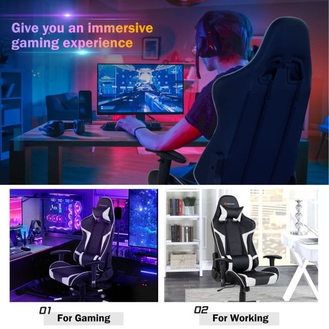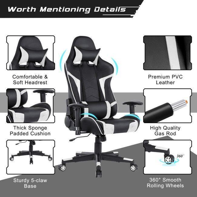 An ergonomic adjustable backrest (90° to 180°) is designed for resting; gaming; working; etc.Back massaging support alleviates pain for greater comfortEasily adjustable seat height to meet different requirementsA high-density cushion ensures structural stability and long-time useFaux leather upholstery for increased softness; excellent durability and breathabilityAdjustable armrest provides soft support for your arms360° swivel chair for convenient maneuverability5-claw base disperses pressure exerted on the chair for increased stabilitySmooth-rolling wheels allow you to move around with easeSuitable for both gamers in the gaming room and workers in the office