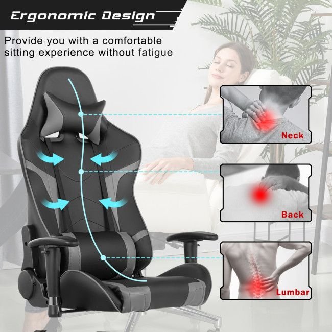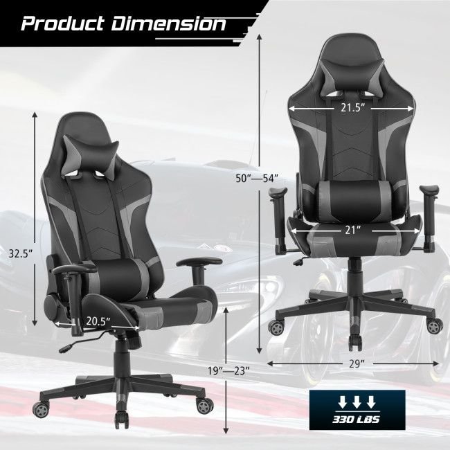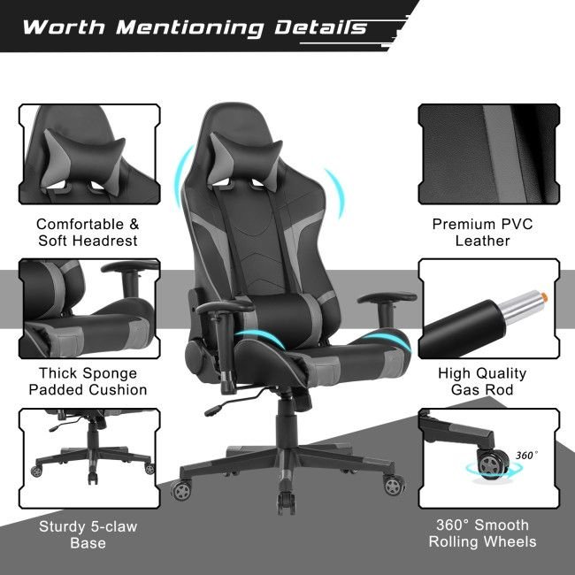 An ergonomic adjustable backrest (90° to 180°) is designed for resting; gaming; working; etc.Back massaging support alleviates pain for greater comfortEasily adjustable seat height to meet different requirementsA high-density cushion ensures structural stability and long-time useFaux leather upholstery for increased softness; excellent durability and breathabilityAdjustable armrest provides soft support for your arms360° swivel chair for convenient maneuverability5-claw base disperses pressure exerted on the chair for increased stabilitySmooth-rolling wheels allow you to move around with easeSuitable for both gamers in the gaming room and workers in the office