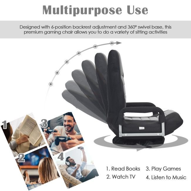 1.6-Position Adjustment and 360° Swivel: The floor chair is designed with an adjustable 6-position backrest to fulfill different individual requirements. Adjust the backrest to your desired Angle with ease, which only needs you to exert your body pressure on it.