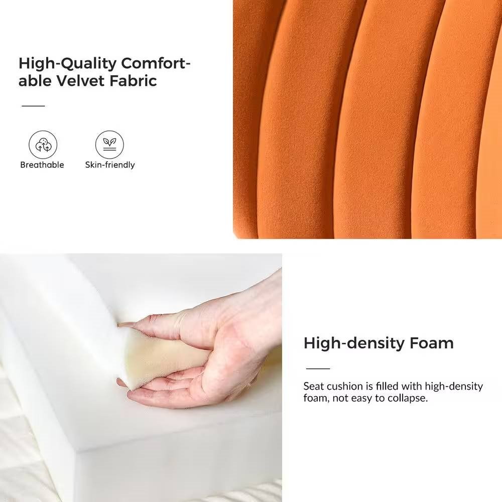 This Orange Velvet Upholstered Wingback Accent Side Chair with Gold Metal Legs is the perfect pick for small space. Whether drawn up to your dining table or rounding out your living room with an extra seat, a small side chair like this is a great option wherever you need it. Made with premium velvet fabric, comfortable for skin touch. High-density foam filling with a solid and manufactured wood frame provide comfort and support. The slender polished gold metal legs bring the modern design and add to the timeless fashion of this piece.