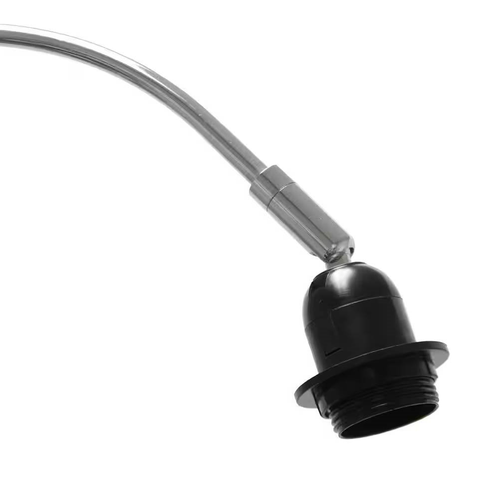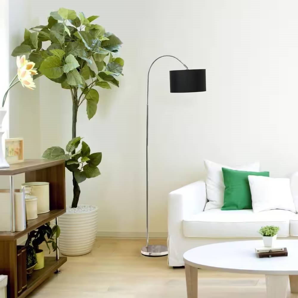 This Mid-Century Modern Floor Lamp in Brushed Nickel Finish with Black Drum Shade is sized perfectly for your living room, dining room, bedroom, or foyer! This beautiful piece will fit perfectly into the space of your choice. The top of the lamp pole curves out to the socket, which locks the shade into place using the provided socket nut. An accessible foot switch is located on the cord of the lamp, making it easy to turn the lamp on/off. The base pole, finished in a lovely brushed nickel finish throughout, sits atop a 10" diameter base. An arched brushed nickel base is paired with a black fabric drum shade for a modern, refined look suitable for your living room, bedroom, office, or foyer! This floor lamp includes 1 x 60W equivalent Type A19 LED Bulb, 8.8W, Warm White 3000K, 800 Lumens. An easily accessible foot switch is located on the cord of this floor lamp to allow a quick and easy on/off function as needed. The lamp is also equipped with a 6 foot black plug in cord rooted at the base. Full assembly is required for this floor lamp, prior to its first use. A step by step manual is provided for easy assembly! Overall product size is L: 11" x W: 27" x H: 66" and weighs 8.18 lbs.