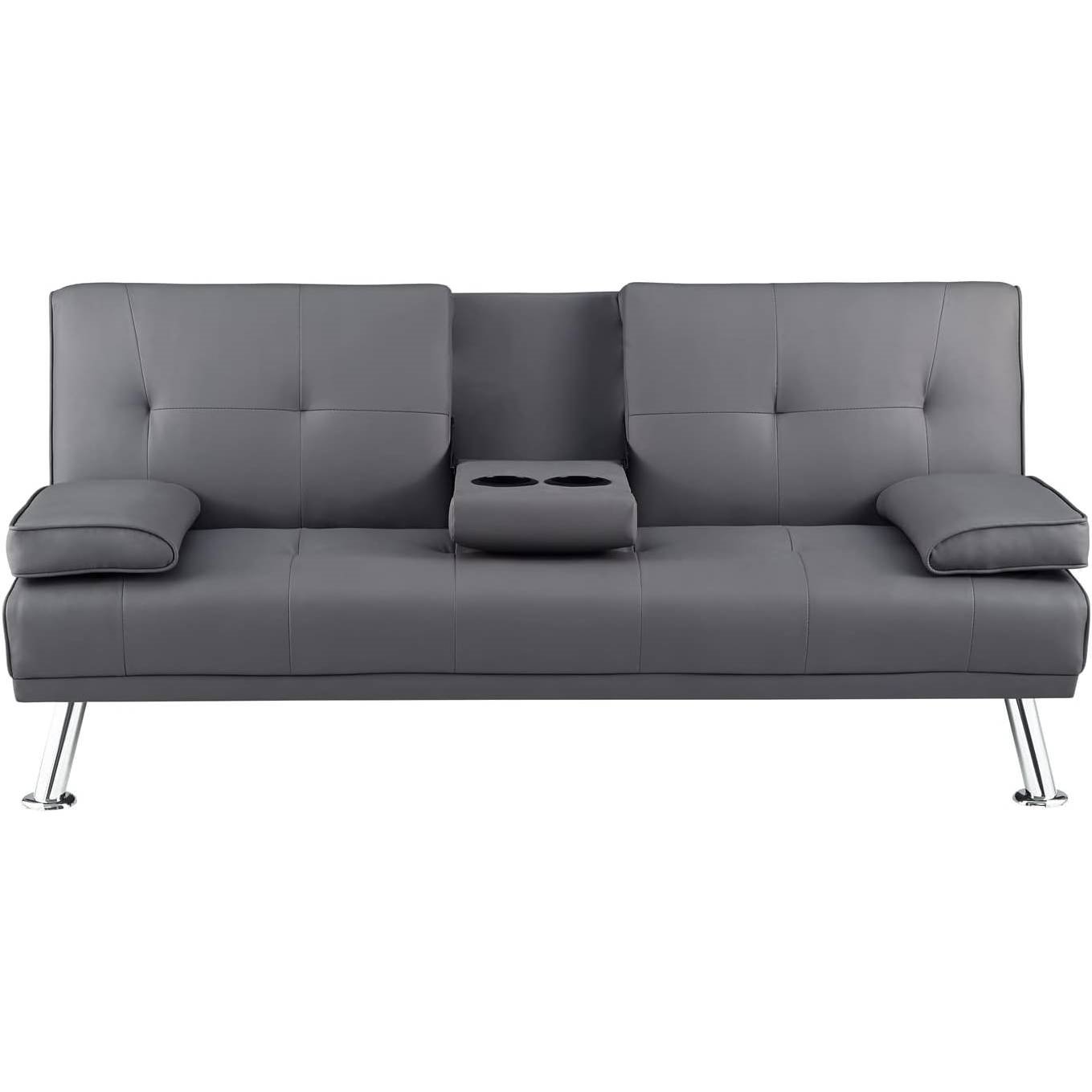 Modern Futon Sleep Sofa Bed Couch in Grey Faux Leather with Cup Holder