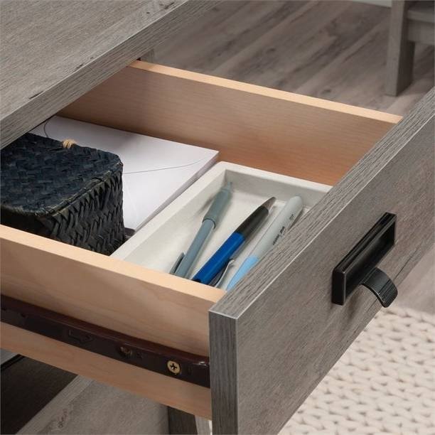 This FarmHouse Light Oak Executive Desk w/ Filing Cabinets Storage offers a spacious top surface that provides you with all the room you need for your must have desk essentials like your laptop, a cup full of pens, stacks of notepads and your favorite coffee mug. You can even find space for home dÈcor items like an accent lamp and picture frames too. This computer desk features 2 small drawers that open and close on smooth metal runners for easy access storage of supplies. It also includes 2 file drawers with full extension slides to hold letter-size hanging files. Other features include a grommet hole for cord access so you can keep all your wires neat and out of the way.