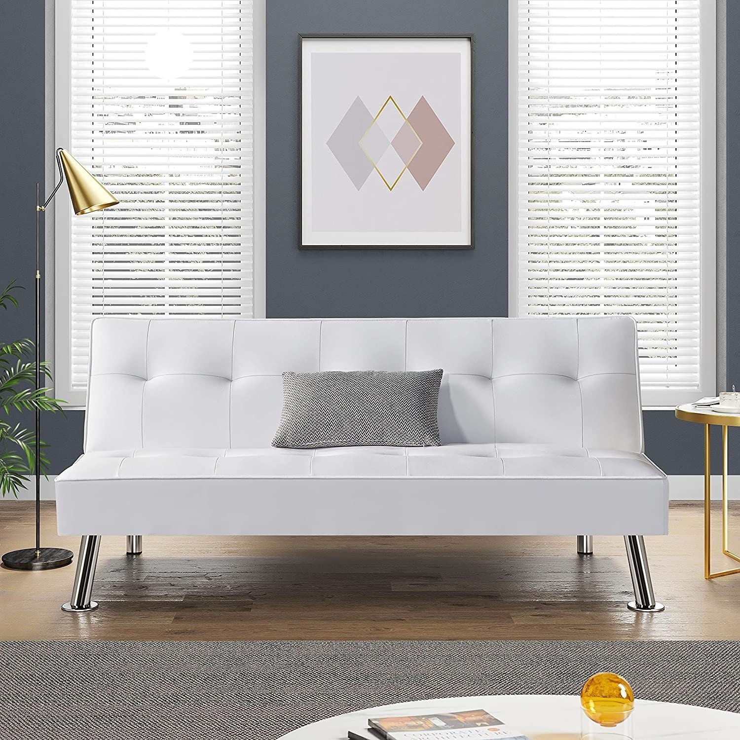 This White Faux Leather Click Clack Adjustable Futon Sleeper Sofa provides functional and aesthetic furniture for any limited space. Crafted from a plywood frame, faux leather covering, foam fill, and strong metal spring, this convertible sofa bed features a flexible folding contraption to lock the back at 2 tilt angles for reading and lounging or lay it down as a comfy platform bed. With the solid construction, it can easily hold up to 770lb. The tufted faux leather upholstery presents an understated yet luxurious touch.
