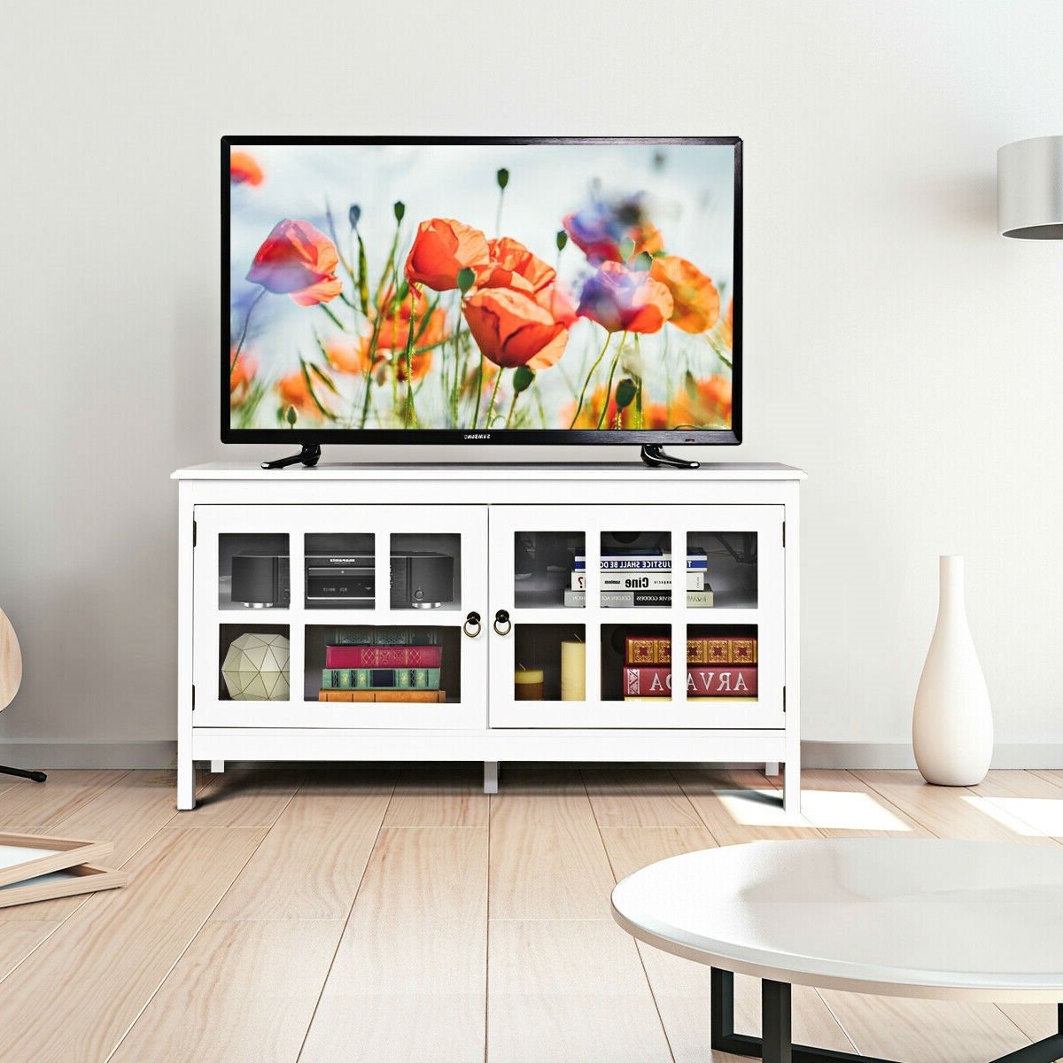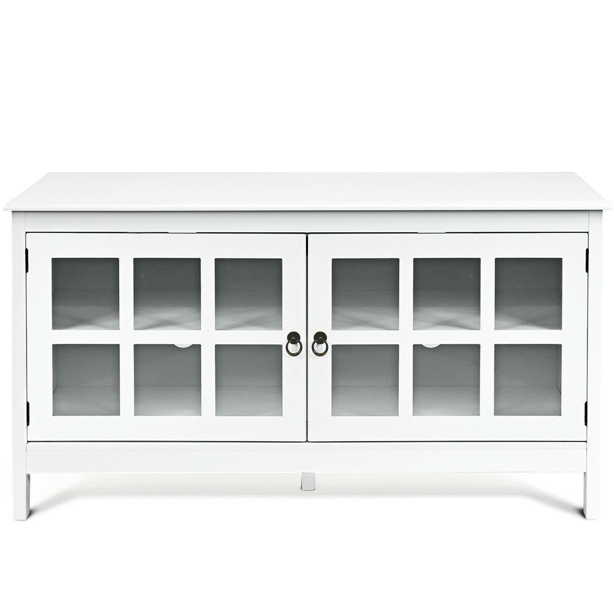 • White Wood Entertainment Center TV Stand with Glass Panel Doors