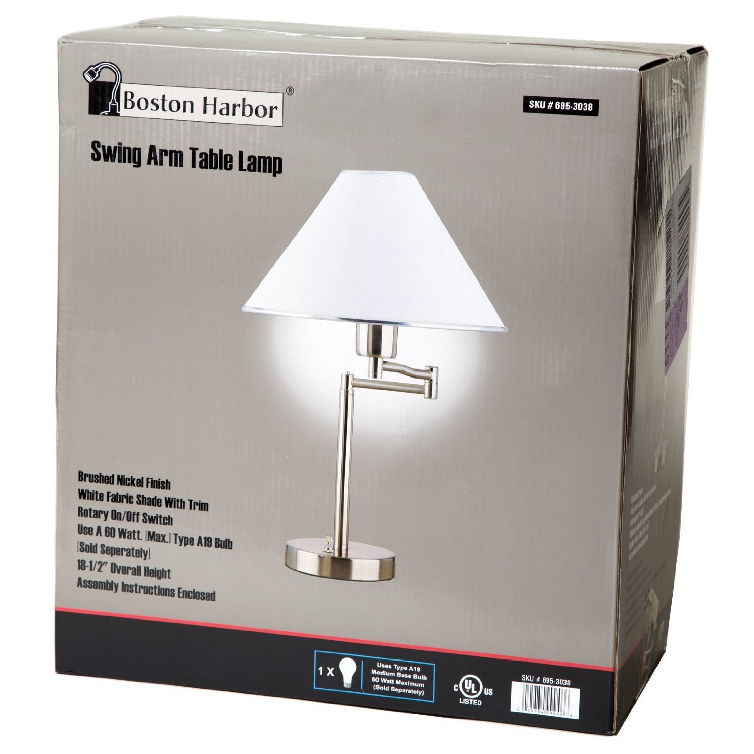 This Sing Arm Table Lamp in Brushed Nickel and White Fabric Shade is a great way to provide light at your desk. Lamp is finished in satin nickel and has a white fabric shade with trim. With the swinging arm, the lamp can provide light wherever you need it and can be adjusted to an overall height of 18-1/2". Uses a 60 watt maximum A-19 bulb (sold separately).